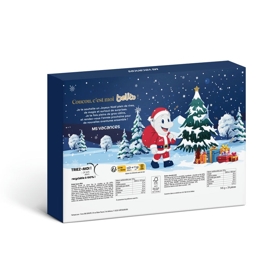 Faites patienter les enfants avec le calendrier de l’Avent Belito aux couleurs de Noël. Son design festif, orné du personnage Belito, cache 24 surprises chocolatées signées Kinder (Kinder chocolat mini et Kinder bueno mini). Idéal pour faire briller les yeux des plus jeunes chaque matin de décembre. Un moment de douceur à savourer jour après jour, en attendant les fêtes.